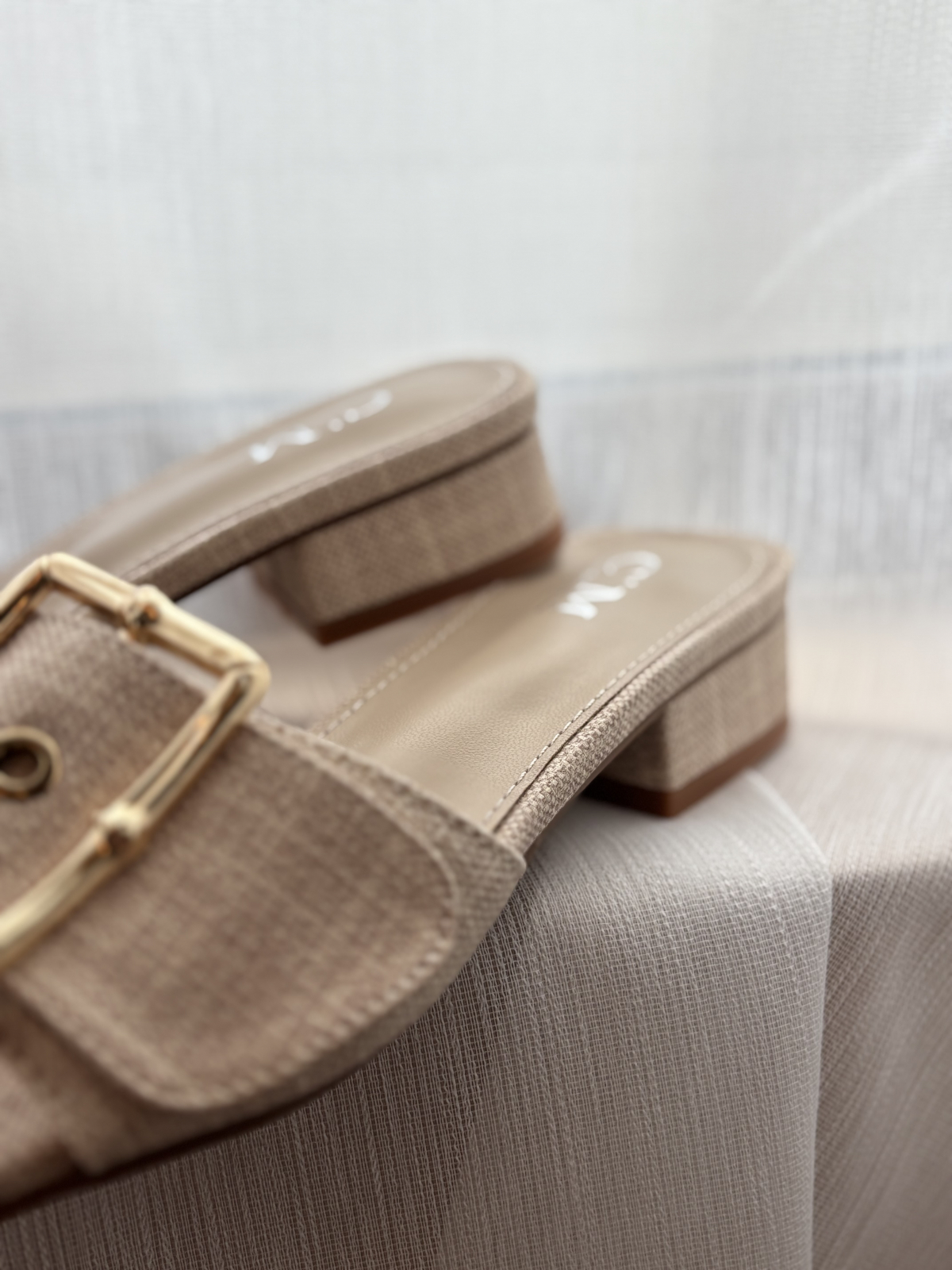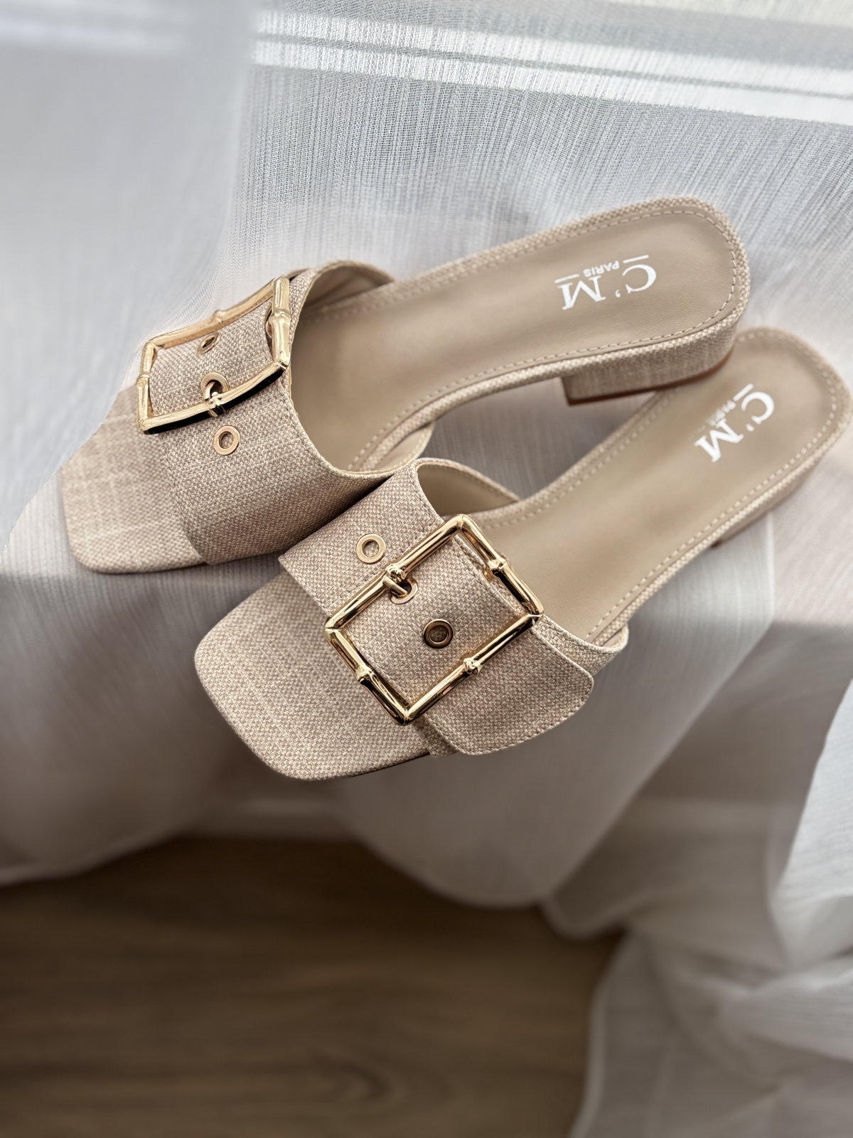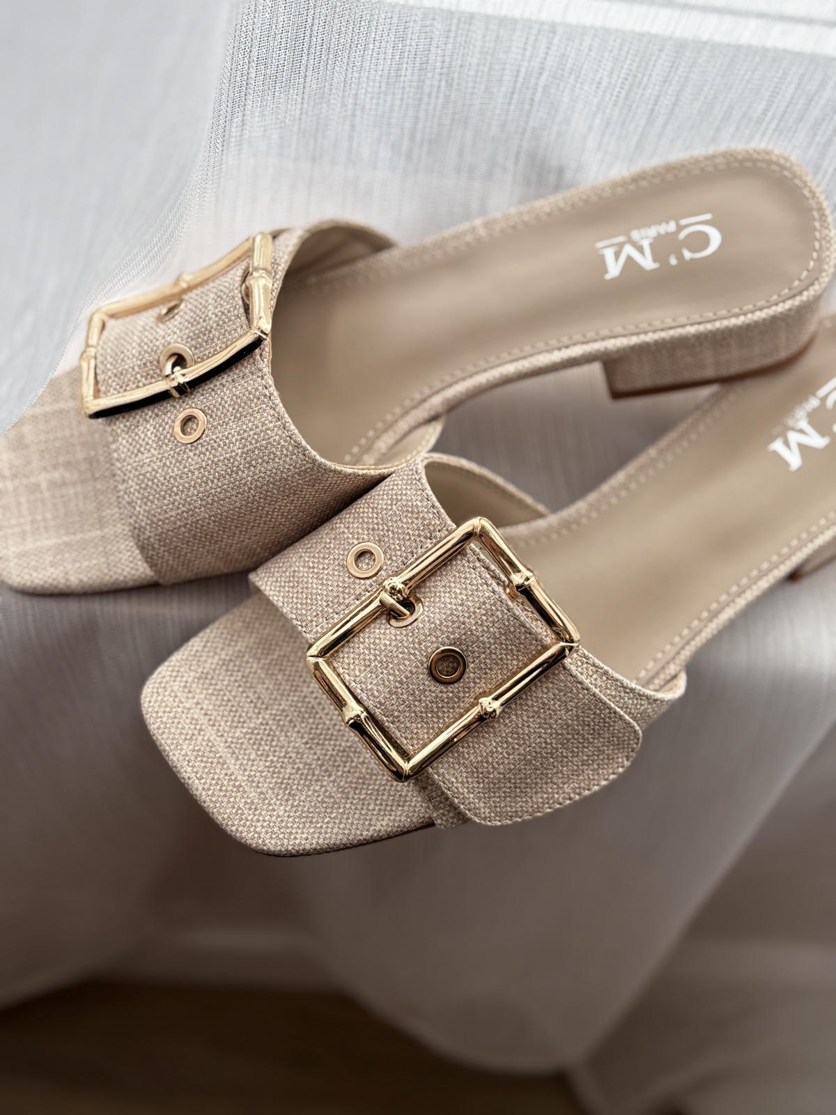 Papuci damă bej cu cataramă aurie și toc mic – simplitate cu stil