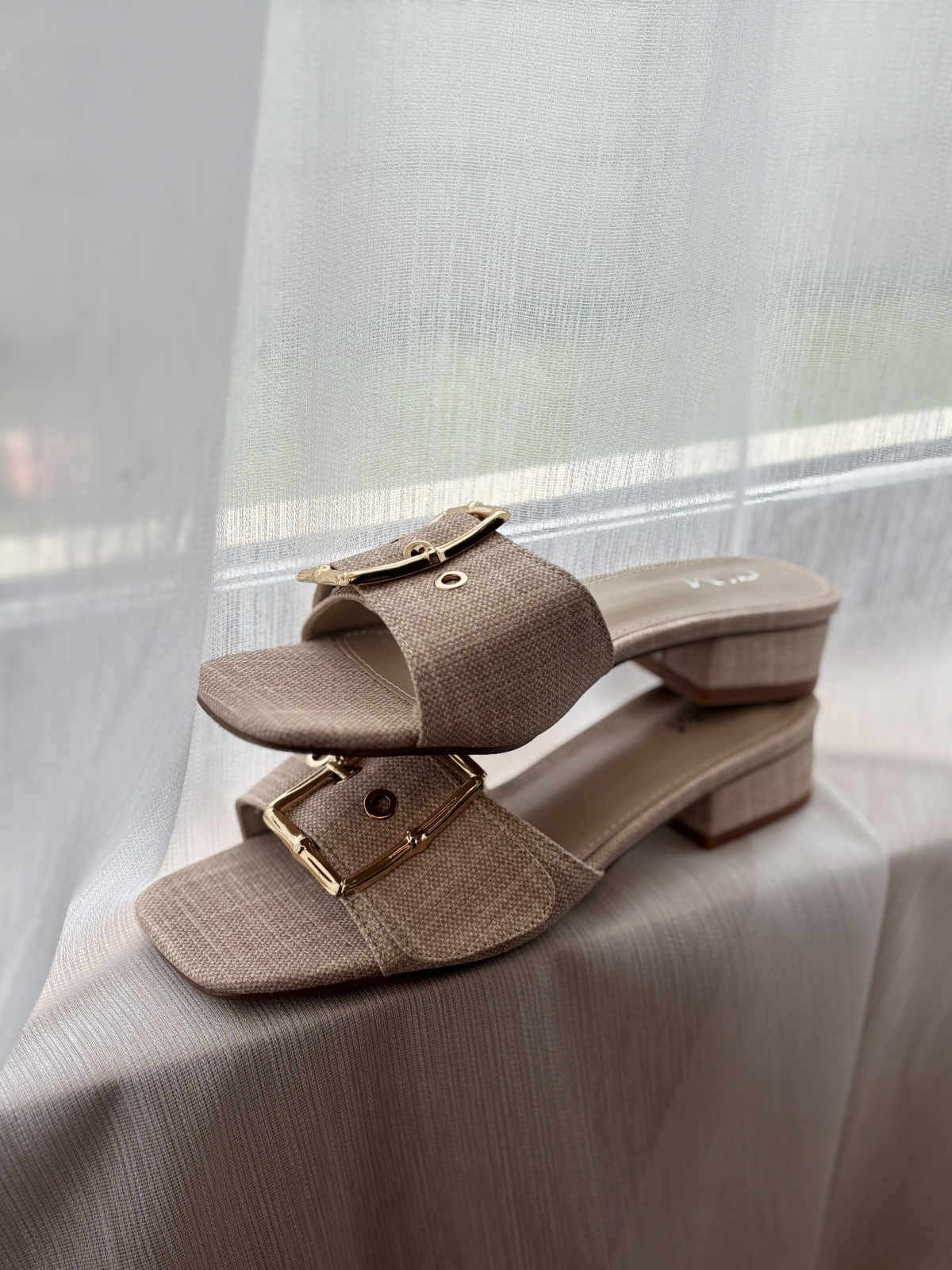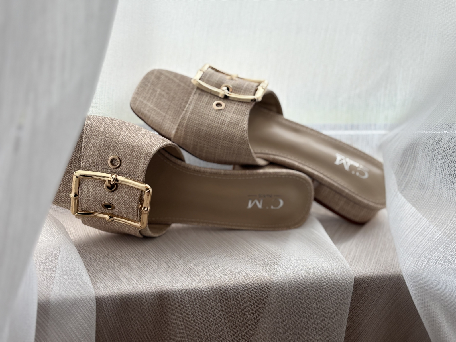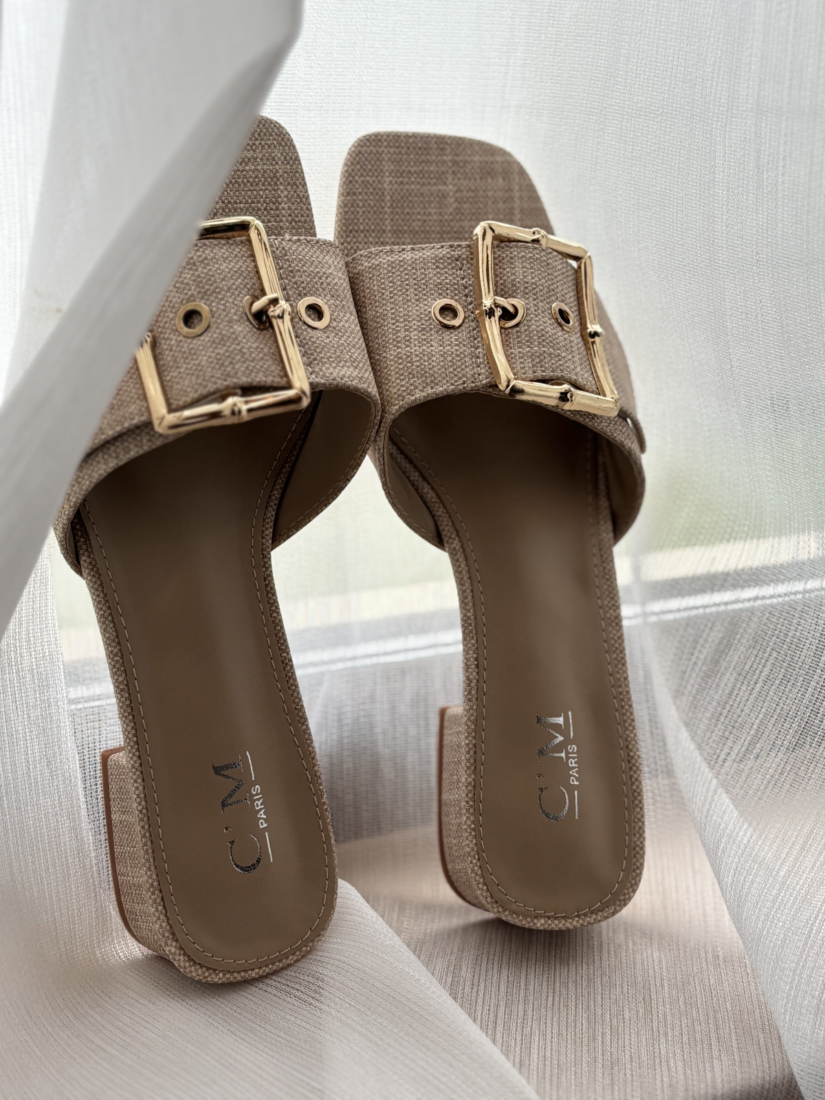 Papuci damă bej cu cataramă aurie și toc mic – simplitate cu stil