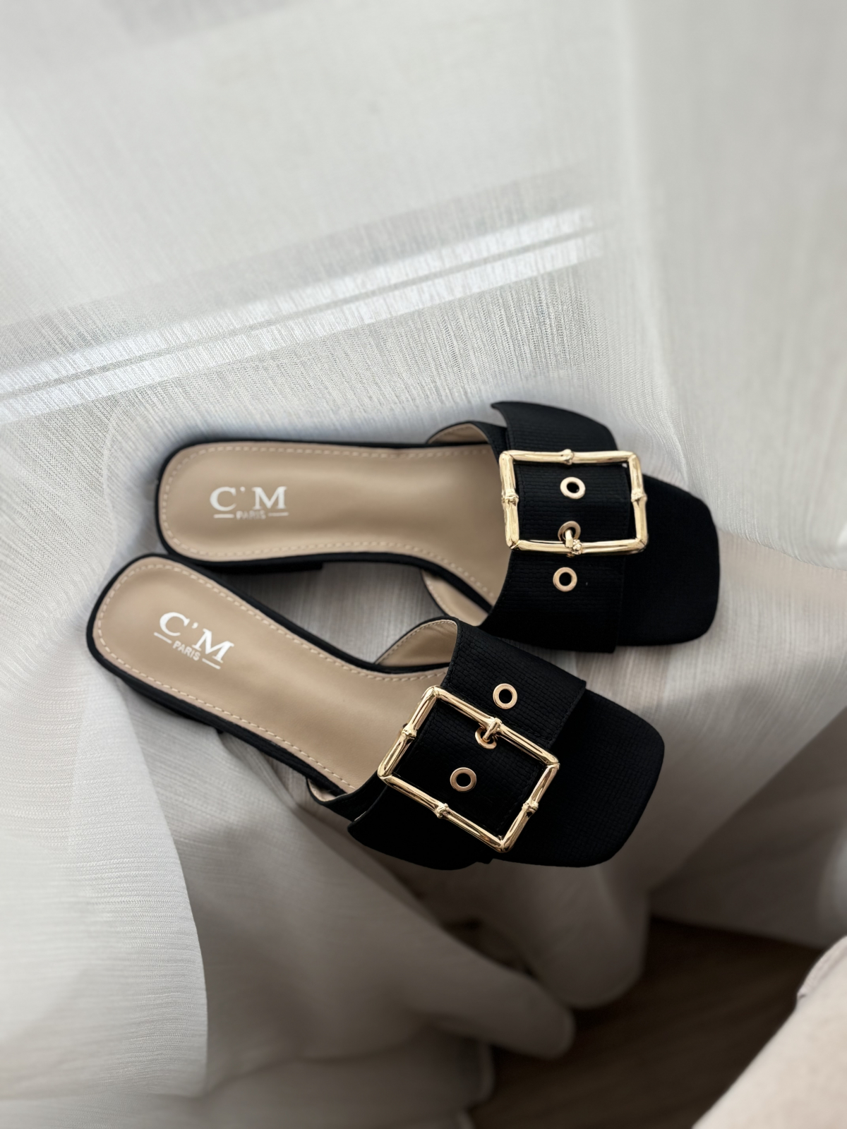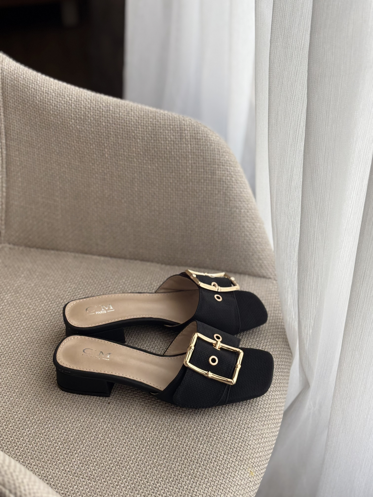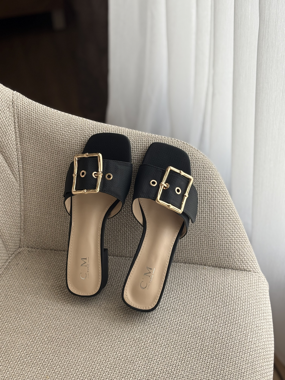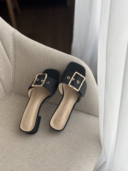 Un model rafinat, perfect pentru zilele călduroase în care vrei să fii comodă, dar elegantă. Acești papuci au un design modern, completat de o cataramă aurie supradimensionată, care atrage subtil atenția. Tocul mic și pătrat oferă stabilitate și confort, fiind alegerea ideală pentru ținute casual-chic sau office.