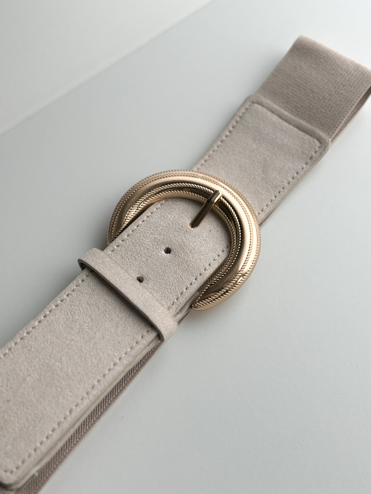 Cureaua elastică pentru dame într-o nuanță de alb ivoitr și cu o cataramă aurie este un accesoriu care îmbină confortul și eleganța într-un mod subtil. Materialul său elastic de înaltă calitate oferă ajustabilitate și potrivire perfectă, adaptându-se liniei taliei într-un mod plăcut și natural.