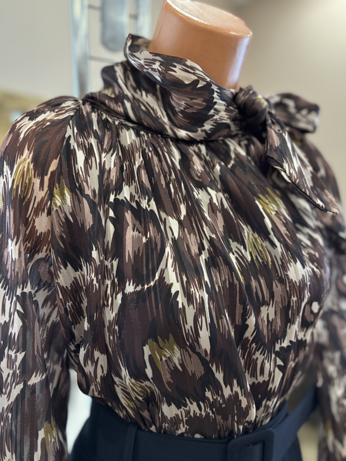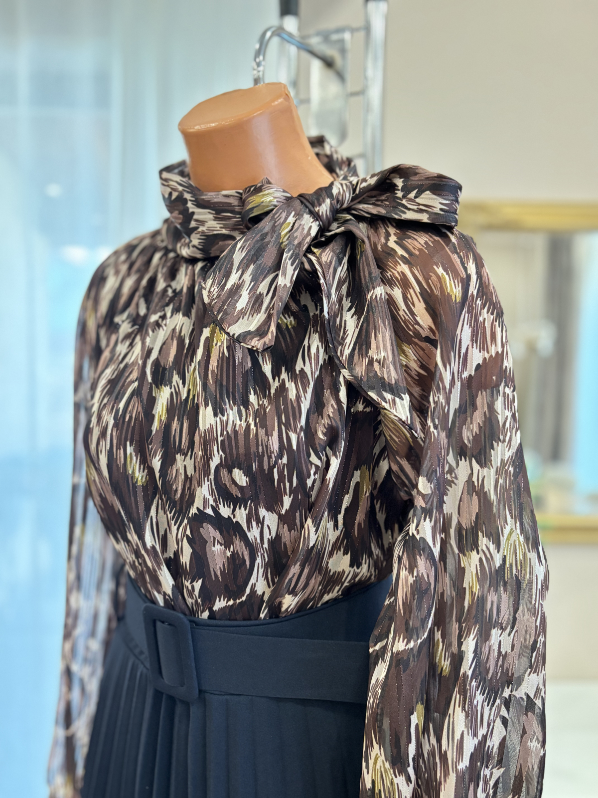 Bluză elegantă cu funda și inserții aurii - maro