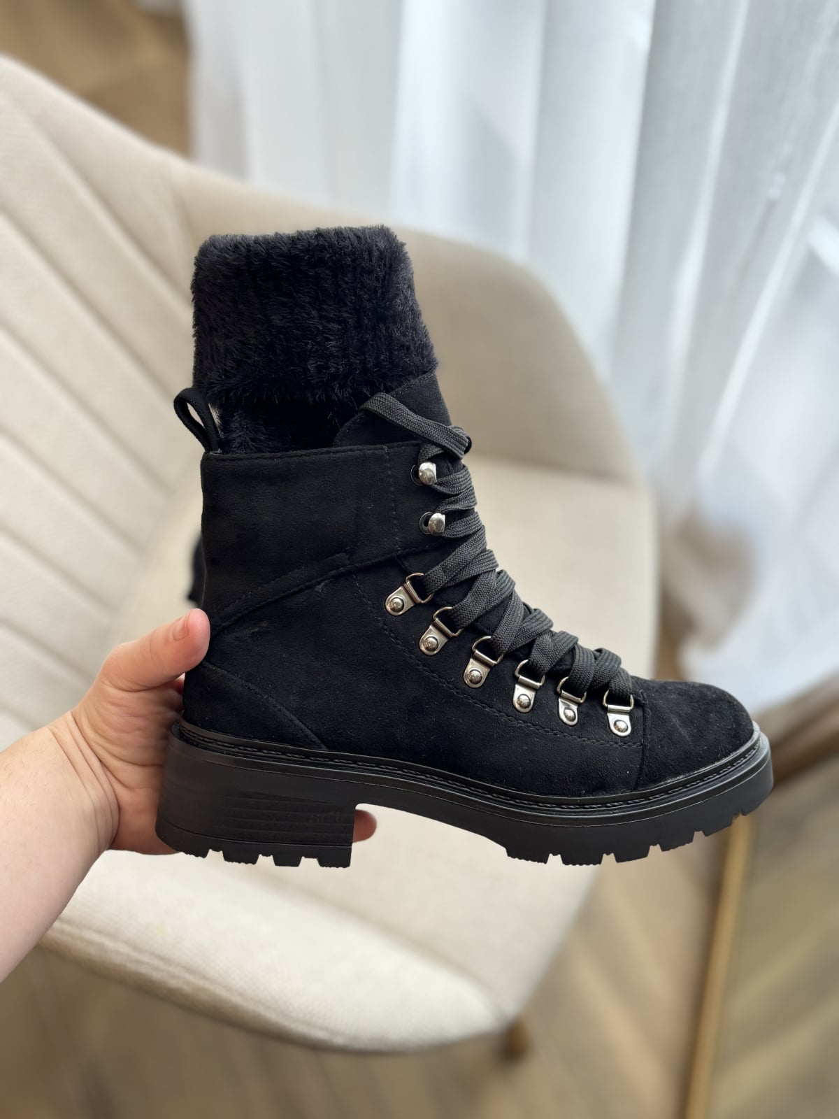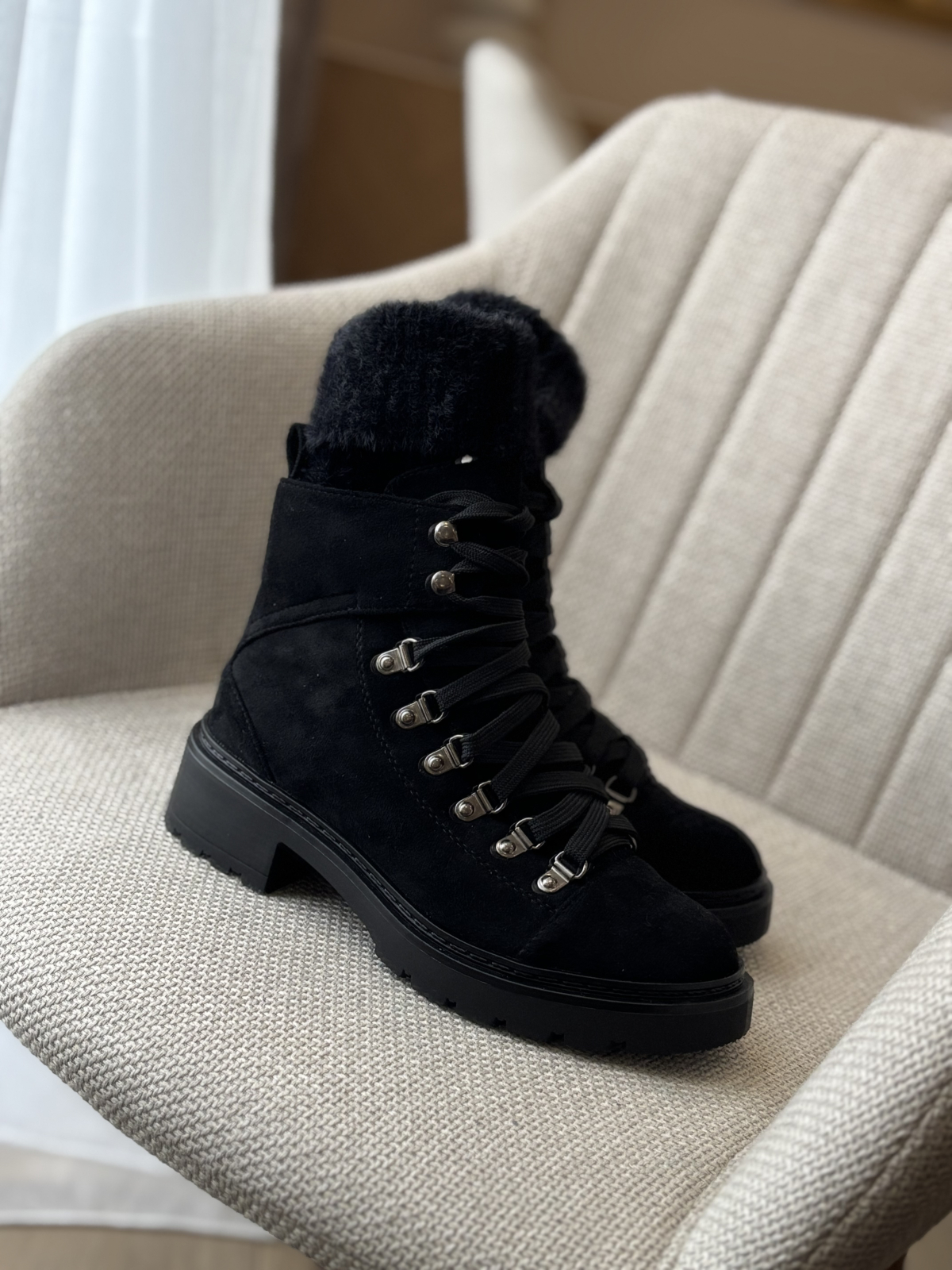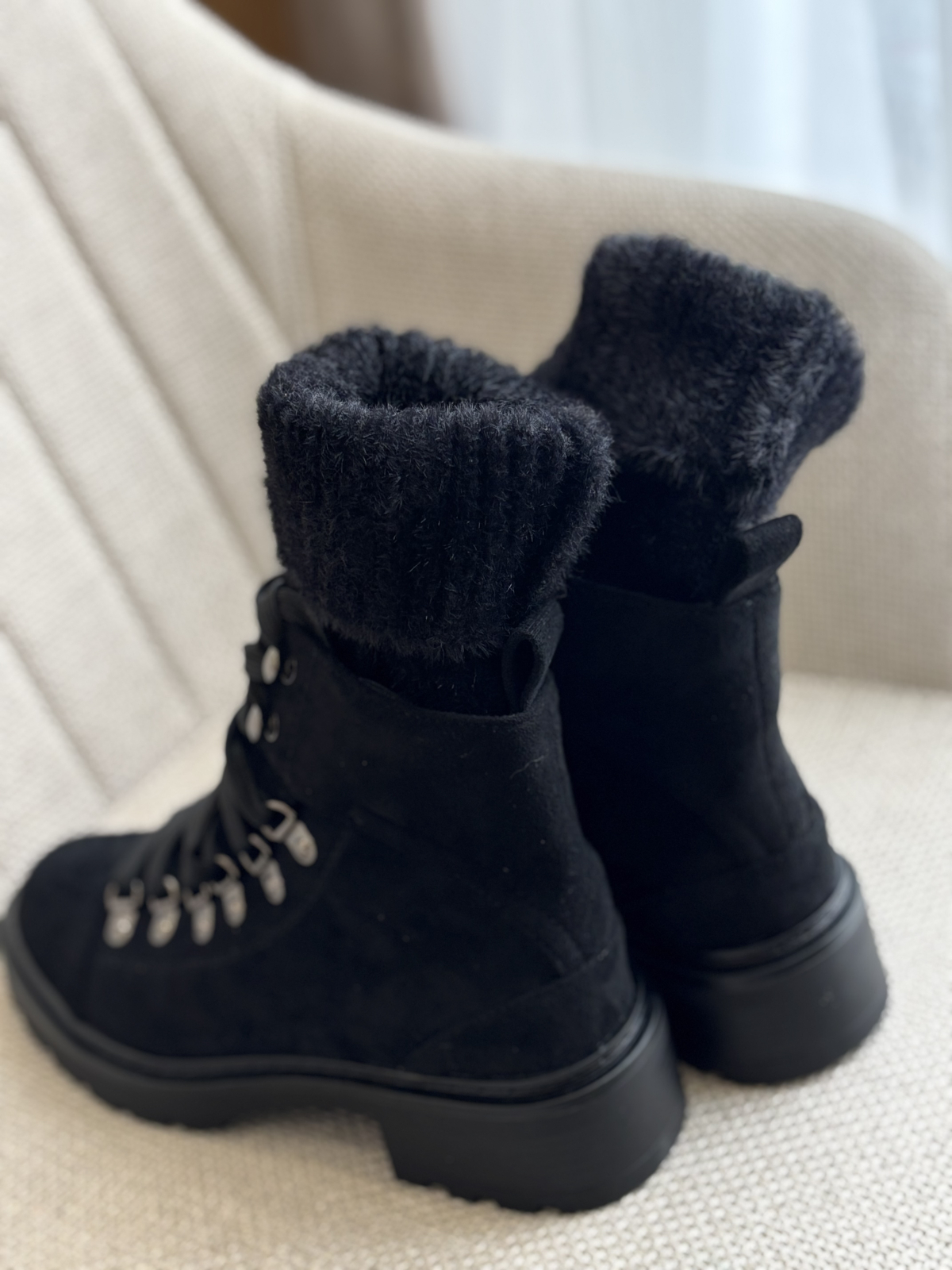 Talpa groasă oferă stabilitate, iar manșeta tricotată adaugă un plus de căldură și rafinament.